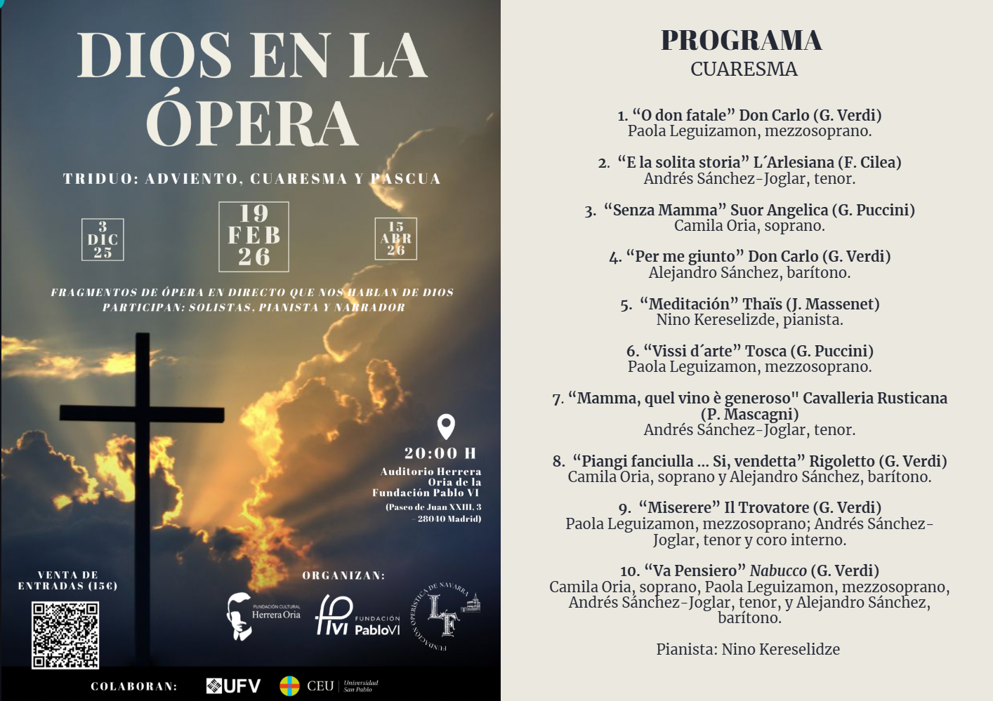 Tras la experiencia del primer concierto, que invitaba a reflexionar sobre el Adviento, en esta ocasión, el recital abundará en el tiempo litúrgico de Cuaresma, con fragmentos cuidadosamente seleccionados de grandes óperas: Don Carlo, de Verdi; Sor Angelica, de G. Puccini; Cavalleria Rusticana, de P. Mascagnia; o Rigoletto, Il Trovatore y Nabucco, de Verdi.