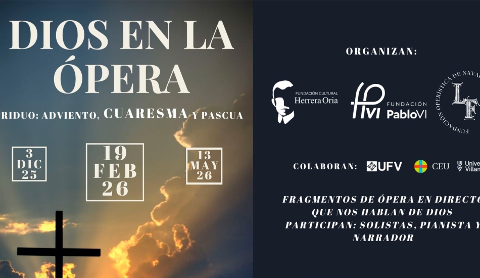 El próximo jueves 19 de febrero, a las 20 horas, tendrá lugar el segundo de los conciertos del triduo "Dios en la Ópera", una propuesta cultural y espiritual para vivir los momentos clave del tiempo litúrgico, organizada conjuntamente por la Fundación Pablo VI, la Fundación Cultural Herrera Oria y la Fundación Operística de Navarra.