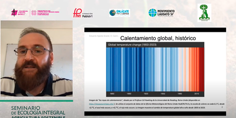 La primera intervención corrió a cargo de Eduardo Agosta, físico carmelita, doctor en Ciencias de la Atmósfera y los Océanos, experto en variabilidad climática y asesor del Movimiento Laudato Si’ y del Dicasterio para el Desarrollo Humano Integral. Su ponencia sirvió para aclarar conceptos sobre lo que es cambio climático y no lo es, cómo éste impacta en el ecosistema regional y global y, en el futuro, cómo va a obligar a modificar radicalmente el modelo de producción agrícola.